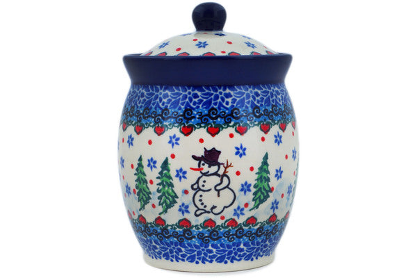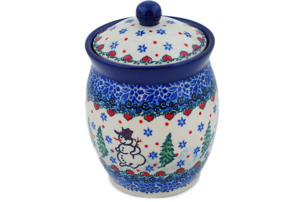 This Polish Pottery 5" Jar with Lid - Dancing Snowman is handmade and handpainted by the Ceramika Artystyczna factory in Boleslawiec, Poland.