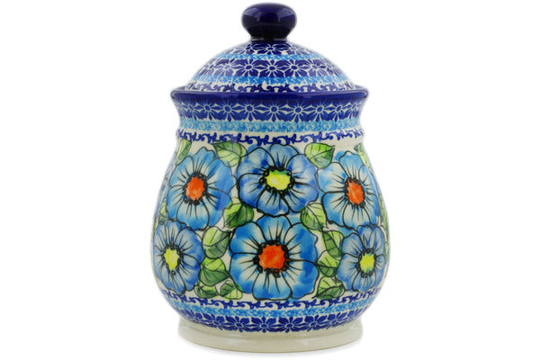 This Polish Pottery 8" Jar with Lid - Bold Blue Poppies is handmade and handpainted by the Ceramika Bona factory in Boleslawiec, Poland.