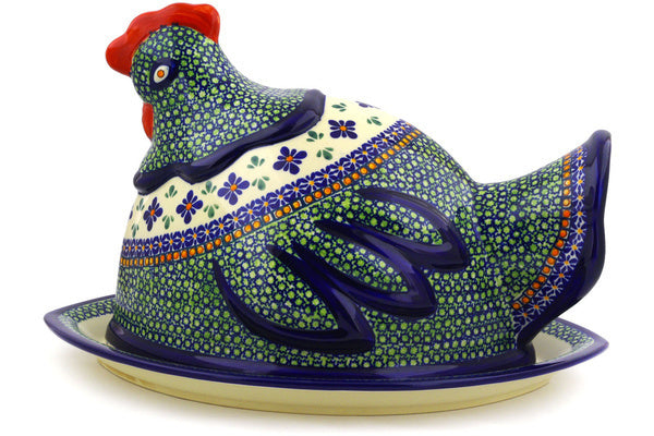This Polish Pottery 14" Dish with Hen Cover - Gingham Flowers is handmade and handpainted by the Zaklady Ceramiczne factory in Boleslawiec, Poland.