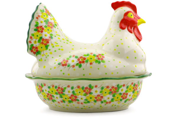 This Polish Pottery 9" Hen Shaped Jar - Blossom Sprinkle is handmade and handpainted by the Ceramika Artystyczna factory in Boleslawiec, Poland.