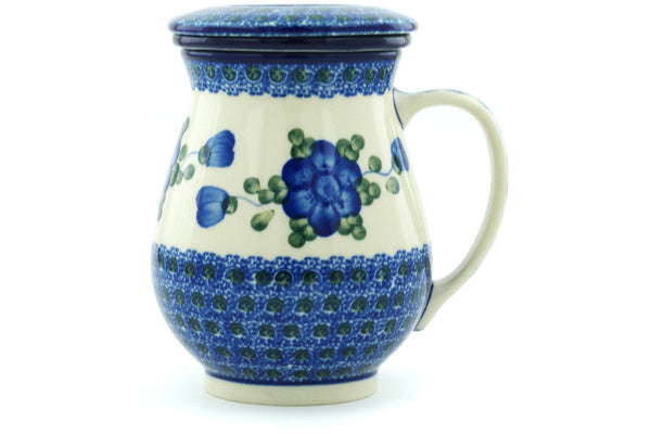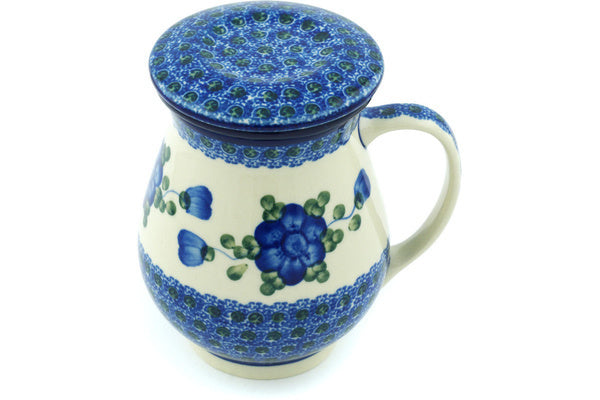 This Polish Pottery 16 oz Brewing Mug - Blue Poppies is handmade and handpainted by the Ceramika Artystyczna factory in Boleslawiec, Poland.