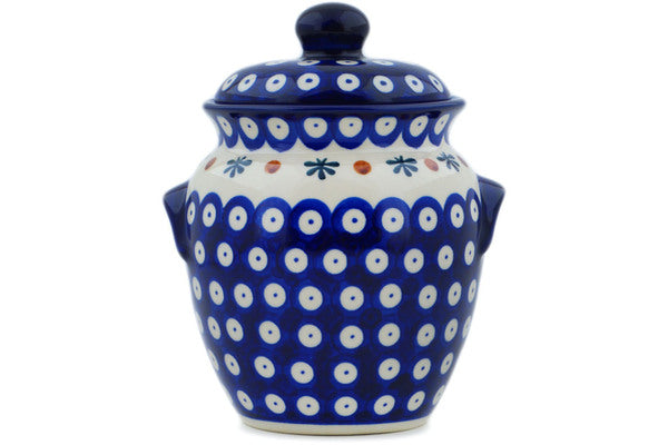 This Polish Pottery 7" Jar with Lid and Handles - Mosquito is handmade and handpainted by the Ceramika Bona factory in Boleslawiec, Poland.