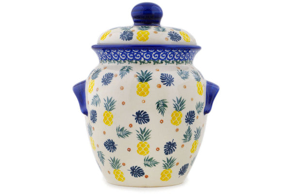 This Polish Pottery 7" Jar with Lid and Handles - Pineapple Parade is handmade and handpainted by the Ceramika Bona factory in Boleslawiec, Poland.