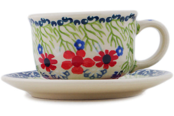 This Polish Pottery 4 oz Cup with Saucer - Red Blossom is handmade and handpainted by the Manufaktura factory in Boleslawiec, Poland.