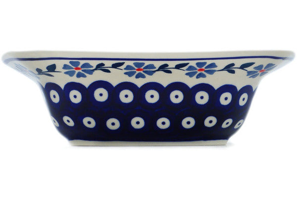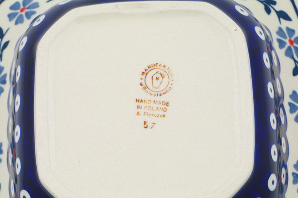 Manufaktura factory stamp | Polish Pottery HouseThis Polish Pottery 8" Square Bowl - Peacock Forget-Me-Not is handmade and handpainted by the Manufaktura factory in Boleslawiec, Poland.