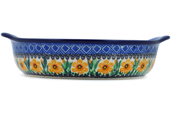 This Polish Pottery 11" Round Baker with Handles - Yellow Daffodil Field is handmade and handpainted by the Ceramika Artystyczna factory in Boleslawiec, Poland.