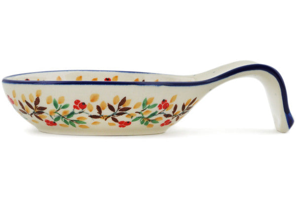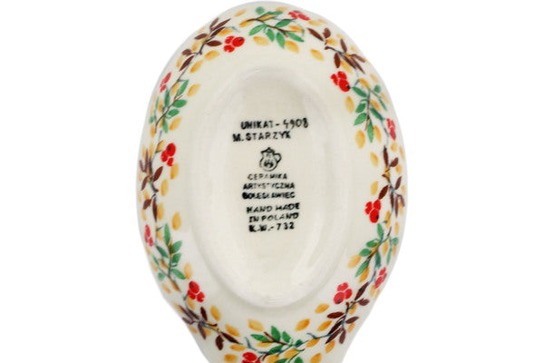 This Polish Pottery 7" Spoon Rest - Bullfinch On Rowan is handmade and handpainted by the Ceramika Artystyczna factory in Boleslawiec, Poland.