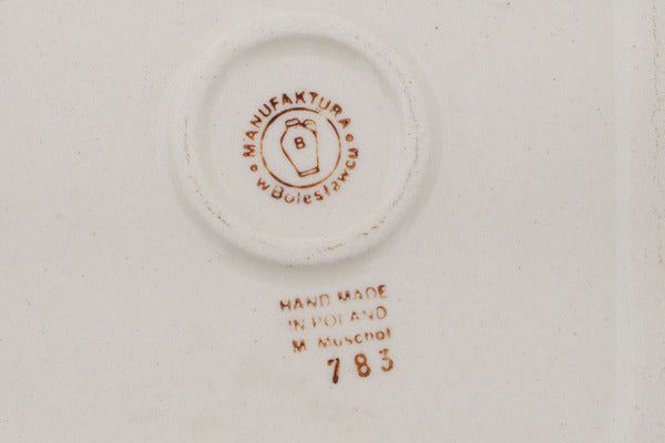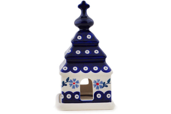 This Polish Pottery 8" Chapel Candle Holder - Peacock Forget-Me-Not is handmade and handpainted by the Manufaktura factory in Boleslawiec, Poland.