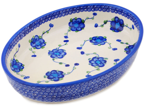This Polish Pottery 13" Oval Baker - Blue Poppies is handmade and handpainted by the Ceramika Bona factory in Boleslawiec, Poland.