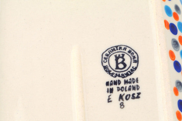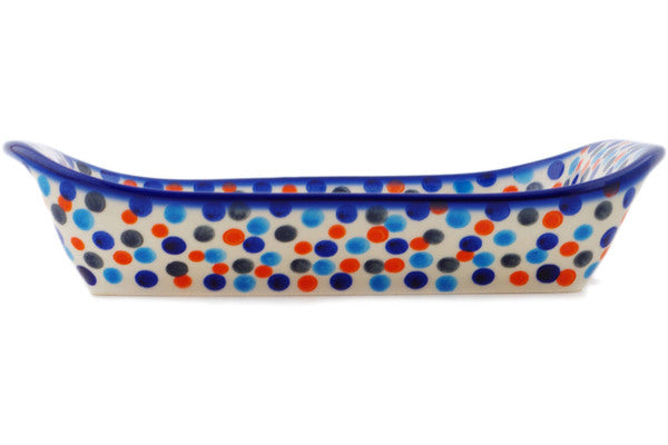 This Polish Pottery 10" Platter with Handles - Polka Dot Frenzy is handmade and handpainted by the Ceramika Bona factory in Boleslawiec, Poland.
