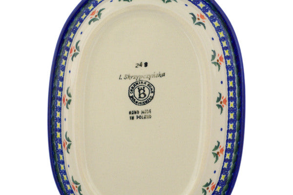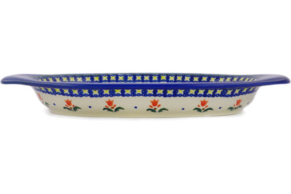 This Polish Pottery 12" Platter with Handles - Cocentric Tulips is handmade and handpainted by the Ceramika Bona factory in Boleslawiec, Poland.