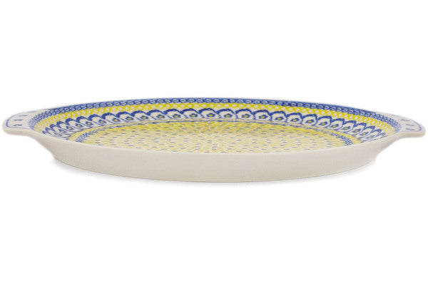 This Polish Pottery 13" Platter with Handles - Happy Days is handmade and handpainted by the Ceramika Artystyczna factory in Boleslawiec, Poland.