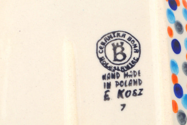 This Polish Pottery 9" Platter with Handles - Polka Dot Frenzy is handmade and handpainted by the Ceramika Bona factory in Boleslawiec, Poland.
