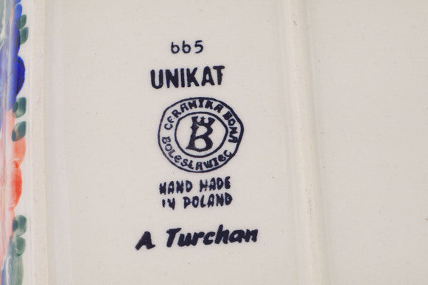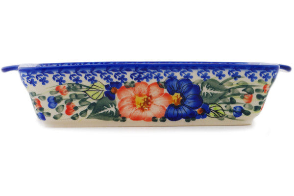 This Polish Pottery 11" Rectangular Baker with Handles - Poppy Trio is handmade and handpainted by the Ceramika Bona factory in Boleslawiec, Poland.