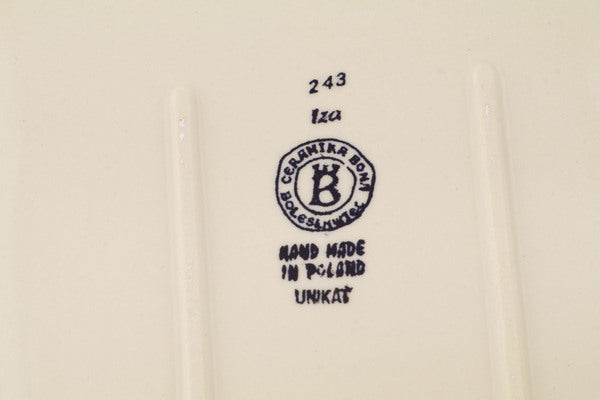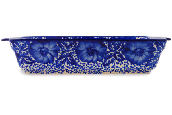 This Polish Pottery 15" Rectangular Baker with Handles - Cobalt Fantasy is handmade and handpainted by the Ceramika Bona factory in Boleslawiec, Poland.