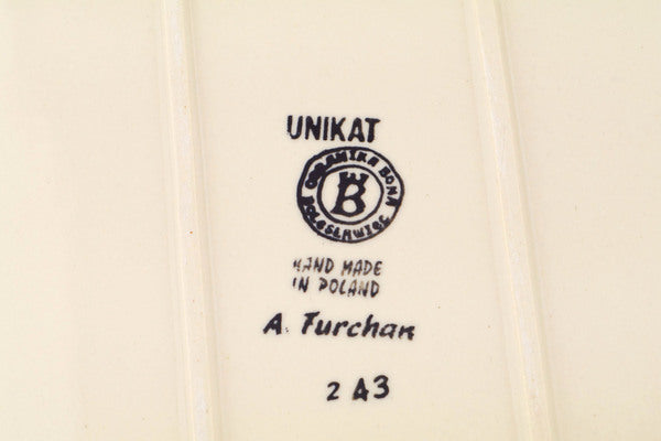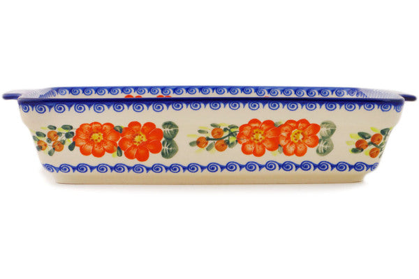 This Polish Pottery 15" Rectangular Baker with Handles - Red Blossom is handmade and handpainted by the Ceramika Bona factory in Boleslawiec, Poland.