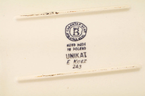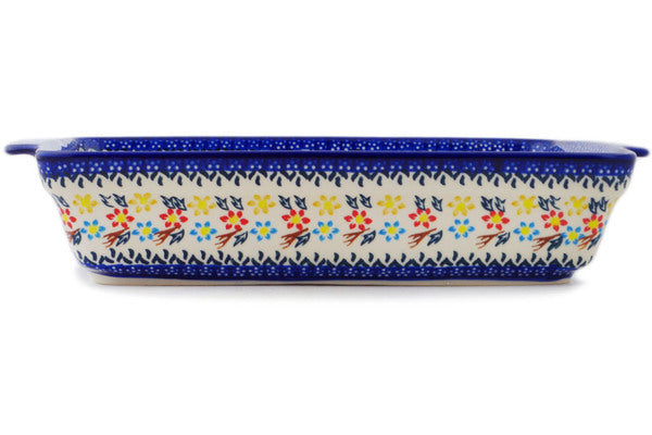 This Polish Pottery 15" Rectangular Baker with Handles - Spring Flower Ring is handmade and handpainted by the Ceramika Bona factory in Boleslawiec, Poland.