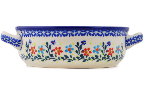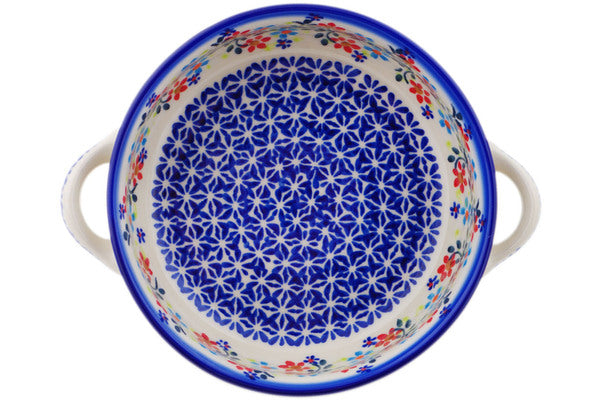 This Polish Pottery 8" Round Baker with Handles - Neon Wreath is handmade and handpainted by the Ceramika Bona factory in Boleslawiec, Poland.