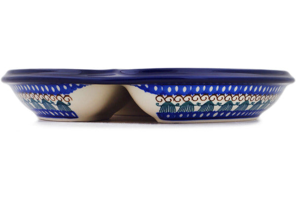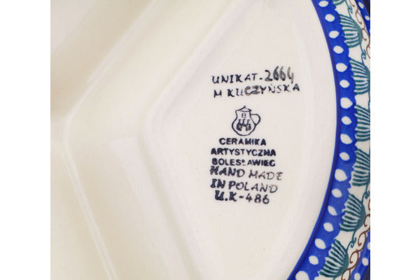 This Polish Pottery 10" Divided Dish - Rooster Row is handmade and handpainted by the Ceramika Artystyczna factory in Boleslawiec, Poland.