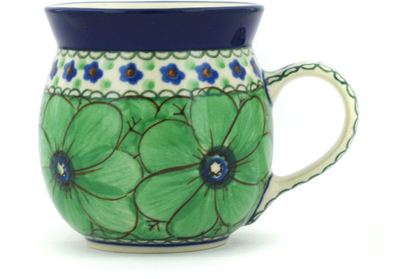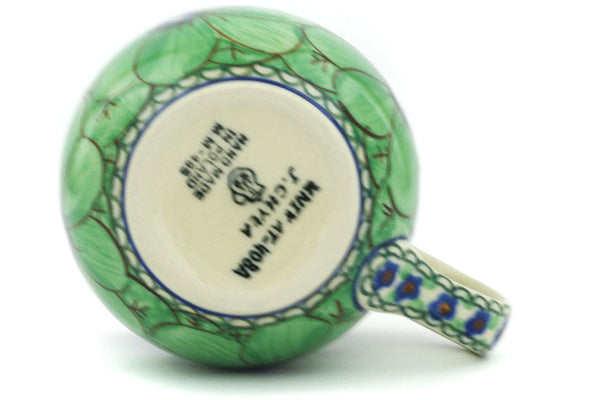 This Polish Pottery 8 oz Bubble Mug - Green Pansies is handmade and handpainted by the Ceramika Artystyczna factory in Boleslawiec, Poland.