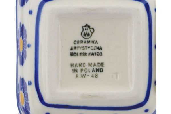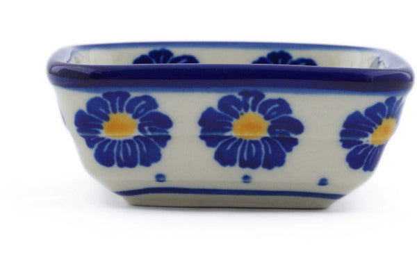 This Polish Pottery 3" Square Bowl - Blue Zinnia is handmade and handpainted by the Ceramika Artystyczna factory in Boleslawiec, Poland.