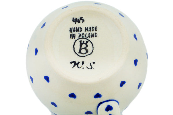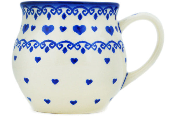 This Polish Pottery 12 oz Bubble Mug - Blue Valentine Hearts is handmade and handpainted by the Ceramika Bona factory in Boleslawiec, Poland.