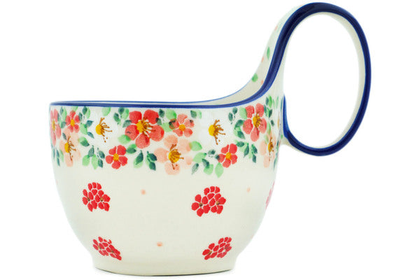 This Polish Pottery 6" Bowl with Loop-Handle - Rosey Starburst Poppy is handmade and handpainted by the Ceramika Artystyczna factory in Boleslawiec, Poland.