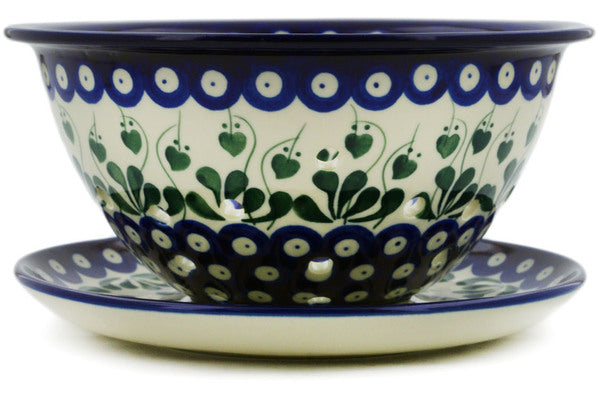 This Polish Pottery 8" Colander with Plate - Bleeding Heart Peacock is handmade and handpainted by the Ceramika Artystyczna factory in Boleslawiec, Poland.