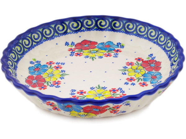 This Polish Pottery 10" Fluted Pie Dish - Country Three is handmade and handpainted by the Ceramika Bona factory in Boleslawiec, Poland.