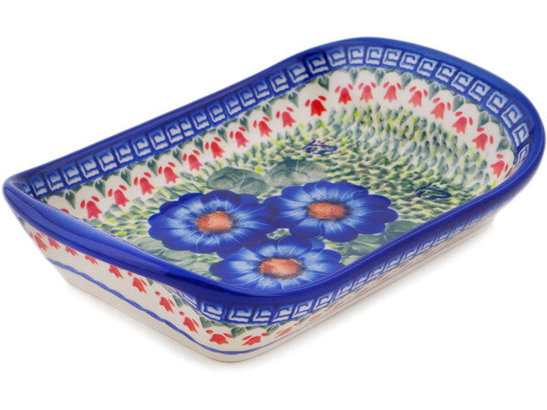 This Polish Pottery 10" Platter with Handles - Brilliant Butterfly Popp is handmade and handpainted by the Ceramika Bona factory in Boleslawiec, Poland.
