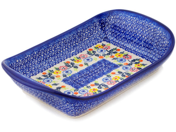 This Polish Pottery 10" Platter with Handles - Pastel Spring Wreath is handmade and handpainted by the Ceramika Bona factory in Boleslawiec, Poland.
