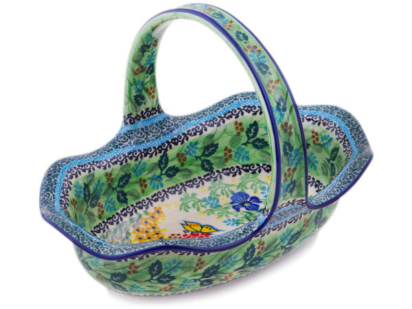 This Polish Pottery 11" Basket with Handle - Spring Garden is handmade and handpainted by the Ceramika Artystyczna factory in Boleslawiec, Poland.
