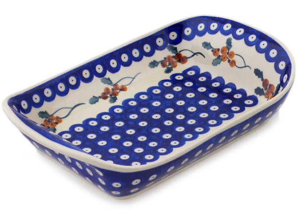 This Polish Pottery 11" Platter with Handles - Yellow Holly Berries is handmade and handpainted by the Ceramika Bona factory in Boleslawiec, Poland.