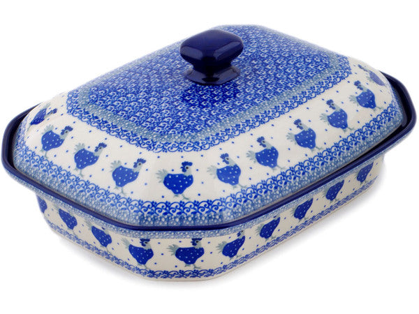 This Polish Pottery 12" Dish with Cover - Cobalt Hen is handmade and handpainted by the Ceramika Artystyczna factory in Boleslawiec, Poland.