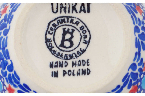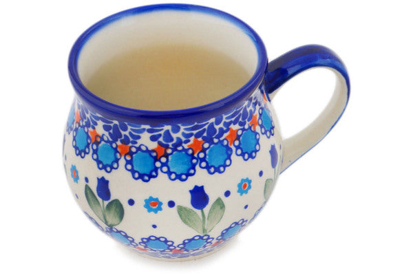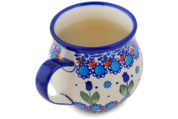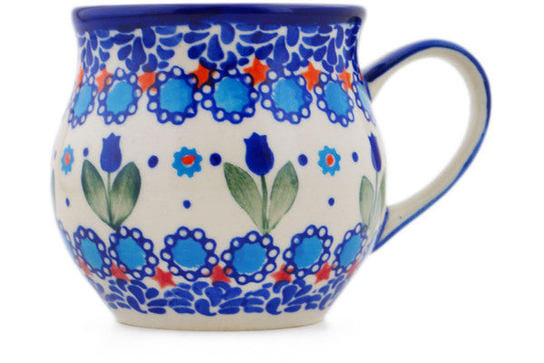 This Polish Pottery 12 oz Bubble Mug - Blue Tulip Garden is handmade and handpainted by the Ceramika Bona factory in Boleslawiec, Poland.