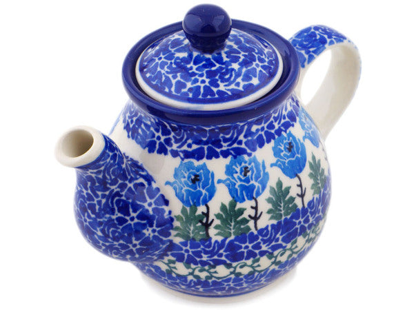 This Polish Pottery 13 oz Tea or Coffee Pot - Blue Rosette Wreath is handmade and handpainted by the Ceramika Artystyczna factory in Boleslawiec, Poland.