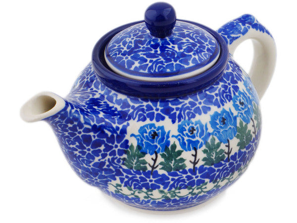 This Polish Pottery 13 oz Tea or Coffee Pot - Blue Rosette Wreath is handmade and handpainted by the Ceramika Artystyczna factory in Boleslawiec, Poland.