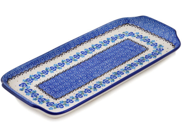 This Polish Pottery 13" Platter with Handles - Blue Bud Sea is handmade and handpainted by the Ceramika Artystyczna factory in Boleslawiec, Poland.