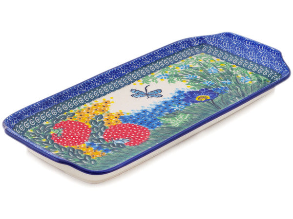 This Polish Pottery 13" Platter with Handles - Dragonfly Delight is handmade and handpainted by the Ceramika Artystyczna factory in Boleslawiec, Poland.