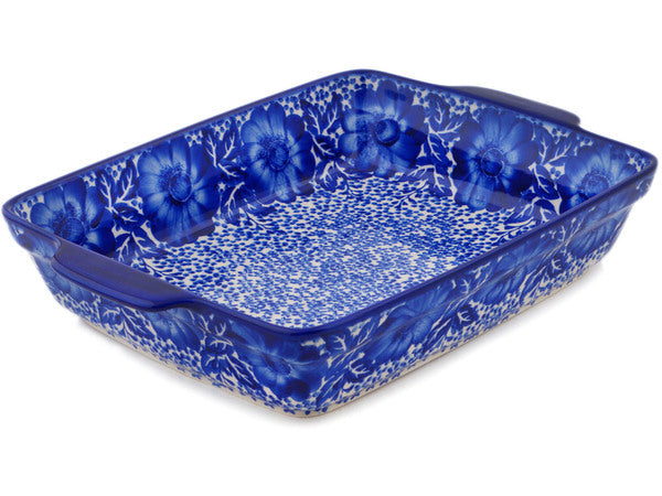 This Polish Pottery 15" Rectangular Baker with Handles - Cobalt Fantasy is handmade and handpainted by the Ceramika Bona factory in Boleslawiec, Poland.