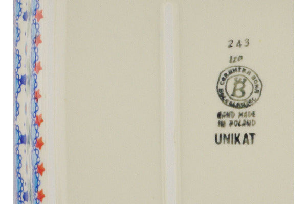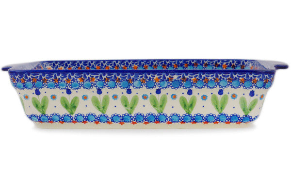 This Polish Pottery 15" Rectangular Baker with Handles - Blue Tulip Garden is handmade and handpainted by the Ceramika Bona factory in Boleslawiec, Poland.