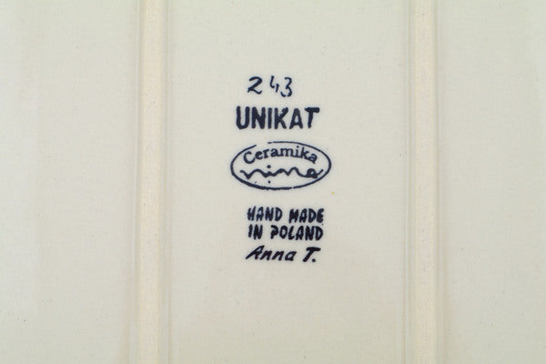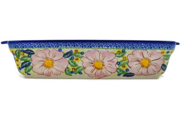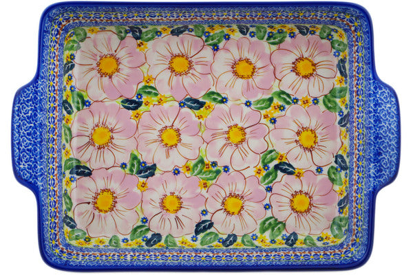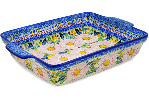 This Polish Pottery 15" Rectangular Baker with Handles - Pink Delight is handmade and handpainted by the Ceramika Nina factory in Boleslawiec, Poland.