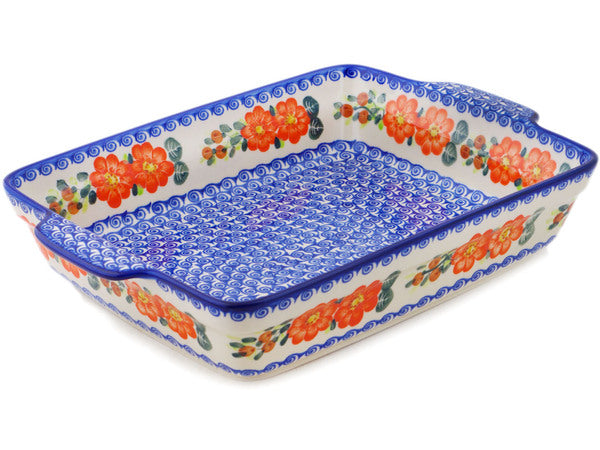 This Polish Pottery 15" Rectangular Baker with Handles - Red Blossom is handmade and handpainted by the Ceramika Bona factory in Boleslawiec, Poland.