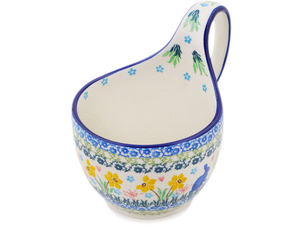 This Polish Pottery 6" Bowl with Loop-Handle - Hopping In Love is handmade and handpainted by the Ceramika Artystyczna factory in Boleslawiec, Poland.