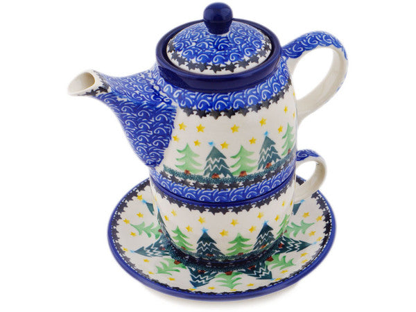 This Polish Pottery 17 oz Tea Set for One - Christmas Evergreen is handmade and handpainted by the Ceramika Artystyczna factory in Boleslawiec, Poland.