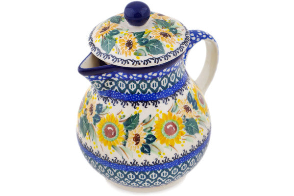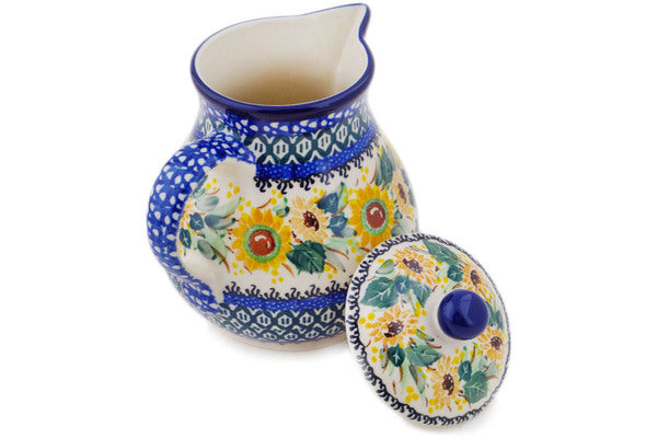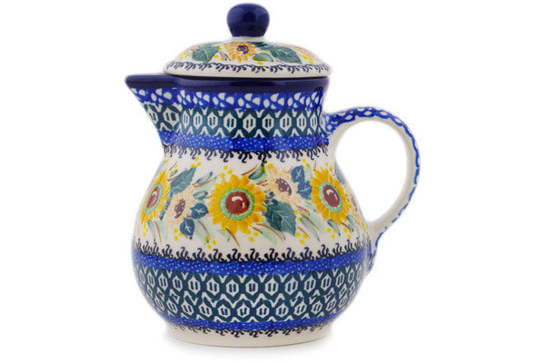 This Polish Pottery 20 oz Pitcher with Lid - Sunflowers At Sunset is handmade and handpainted by the Ceramika Artystyczna factory in Boleslawiec, Poland.