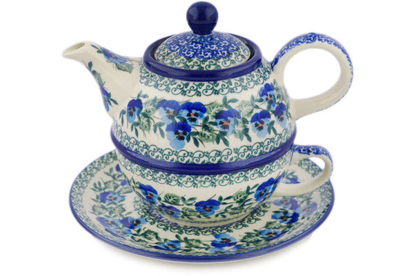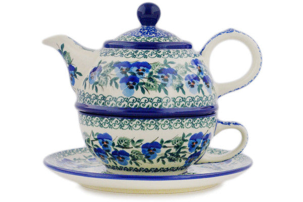 This Polish Pottery 22 oz Tea Set for One - Blue Pansy is handmade and handpainted by the Ceramika Artystyczna factory in Boleslawiec, Poland.
