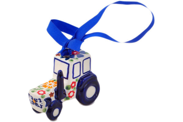 This Polish Pottery 3" Tractor Ornament - Botanical Sprinkles is handmade and handpainted by the Manufaktura factory in Boleslawiec, Poland.