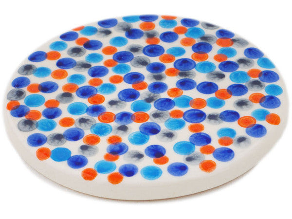 This Polish Pottery 4" Coaster - Polka Dot Frenzy is handmade and handpainted by the Ceramika Bona factory in Boleslawiec, Poland.