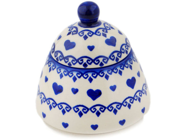 This Polish Pottery 4" Jar with Lid - Blue Valentine Hearts is handmade and handpainted by the Ceramika Bona factory in Boleslawiec, Poland.